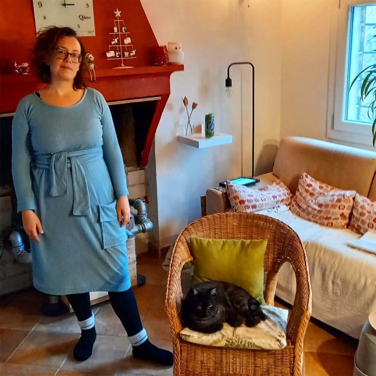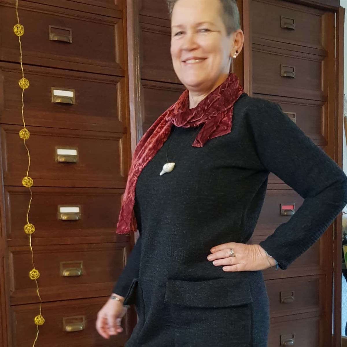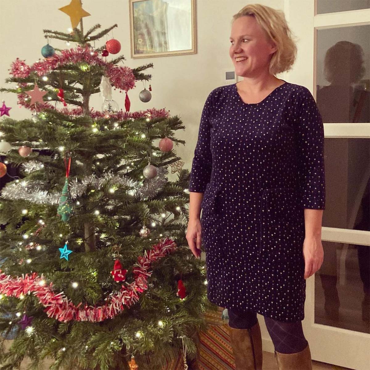 Elke week verscheen een blog met aanwijzingen, en zo werd er gezamenlijk geploeterd aan het patroon tekenen, de jurk in elkaar naaien en zakken en een halskraag maken. Met het idee ‘elke week een uurtje’ werd het zo toch nog een behapbaar project. Dit is het resultaat van enkele van onze deelnemers.