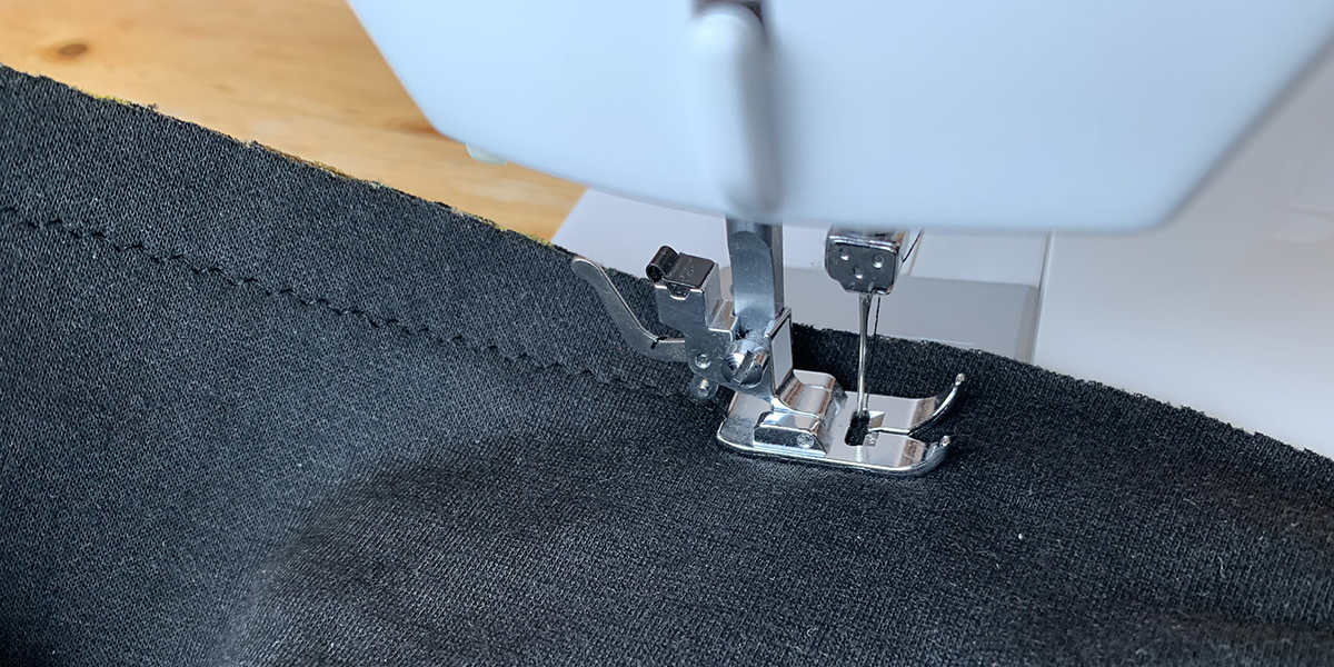 Gebreide stoffen stik je met een meerekkende steek. Dat kan op verschillende manieren: met de speciale locksteek die de meeste huishoudnaaimachines tegenwoordig bezitten, die tegelijkertijd stikt en afwerkt, met de stretchsteek, die alleen meerekkend stikt, of met de zigzagsteek. Ik heb geen lock- of stretchsteek op mijn naaimachine, dus ik gebruik een rechte, grote steek bij wijze van rijgsteek. Daarna zal ik er met een smalle zigzagsteek overheen gaan. Voor het afwerken knip ik de naden op ½ centimeter af en stik ze aan elkaar met de brede zigzagsteek. Dan kan de stof niet rafelen.