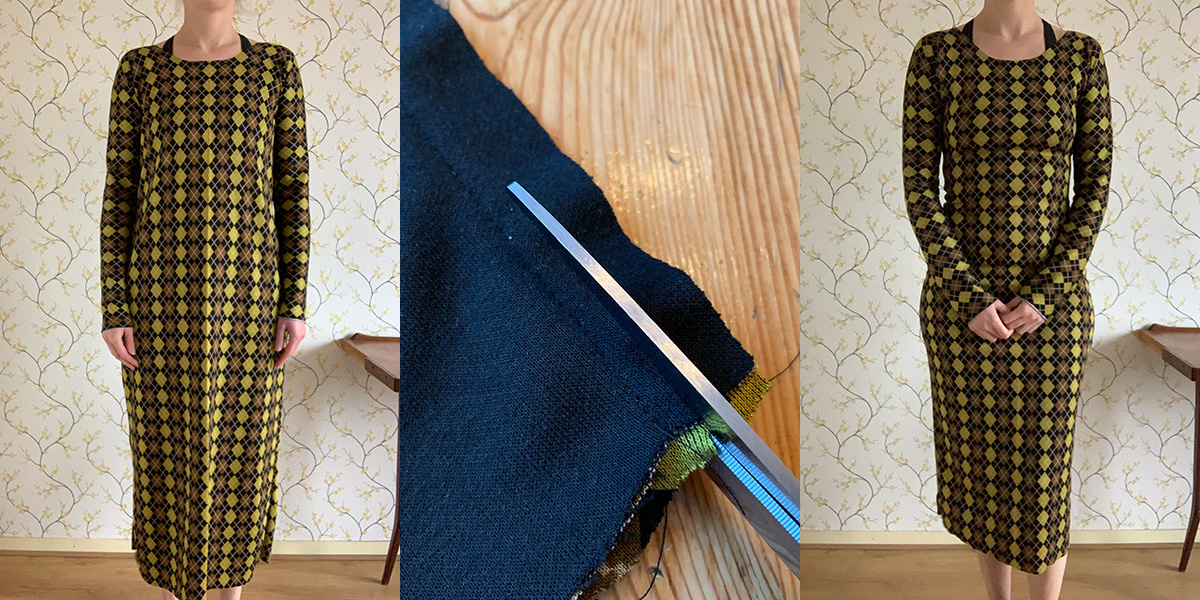Bij het passen vorige week ben ik al tot de conclusie gekomen dat ik de jurk wat nauwer wil stikken. Hij zit nu best wel los en dat is niet mijn stijl. Stijl en smaak zijn natuurlijk heel persoonlijk. Ik heb een vriendin die alleen maar rokken en jurken tot op de knie draagt; ik ga juist altijd voor midi of mini, nooit knielengte. Ik vind midi bij haar mooi staan, net zoals zij knielengte bij mij mooi vindt staan, toch vinden we dat zelf niet. Laat je dus ook nooit door een kledingontwerp ervan overtuigen dat je een andere stijl moet dragen: dat weet je zelf heus het best.