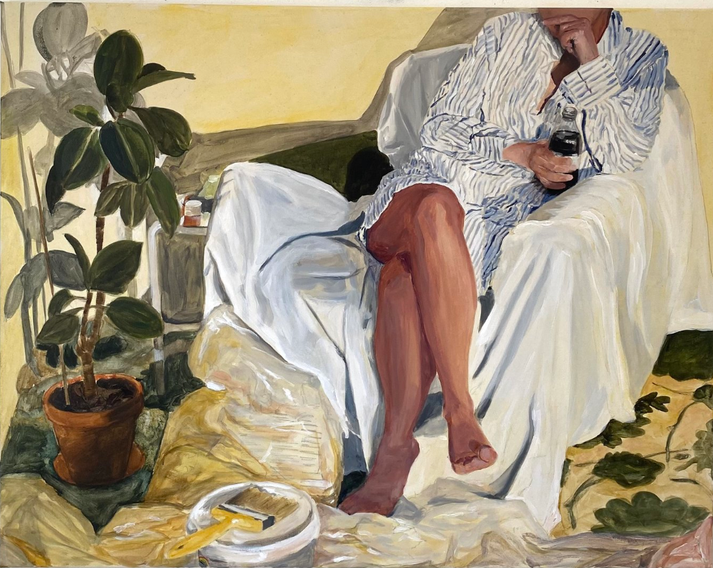 “Eerst maak ik foto’s van vrouwen die ergens mee bezig zijn. Die scènes schilder ik daarna. Met acrylverf, voor olieverf ben ik te ongeduldig. Ik werk tamelijk snel, met grove streken. Ik wil het moment grijpen en niet hoeven wachten totdat de verf eindelijk droog is. Soms breng ik op het einde nog een laag olieverf aan. Tijdens het schilderen draai ik steeds hetzelfde nummer. Laatst was dat As it was van Harry Styles, of Try a little tenderness van Otis Redding. Ik moet in een feelgoodmood komen. Zit ik niet lekker in mijn vel, dan werkt het niet voor mij.”
