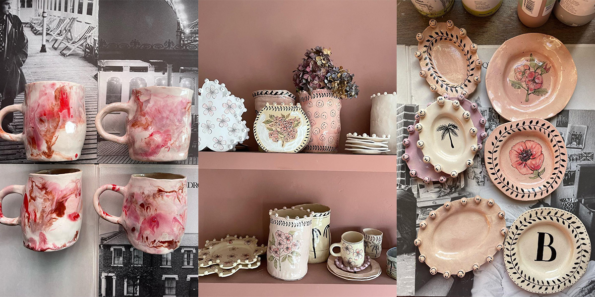 Met een (half-) Engelse man en zoon plus een voorliefde voor seventies’ en nineties’ Britpop, hoefde Iefke de Roos niet lang na te denken over de naam van haar bedrijf: The English Boys. Ze maakt oudroze mokken, vazen, wandborden en sieradenschaaltjes die beschilderd zijn met smileys, palmbomen en bloemen. Elk stuk is met de hand gevormd en daardoor uniek.