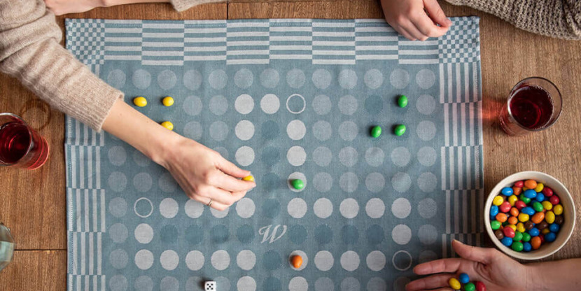 De doeken wegen natuurlijk haast niks, dus ga je op pad en wil je een spel meenemen dan scheelt je dat dozen om mee te sjouwen. Wel zo handig: neem ook pionnen (of een alternatief zoals op de foto) mee als je de deur uitgaat. Rol je doek uit, pionnen erop en spelen maar. En wie verliest, kan met de andere doek na afloop de vaat afdrogen.