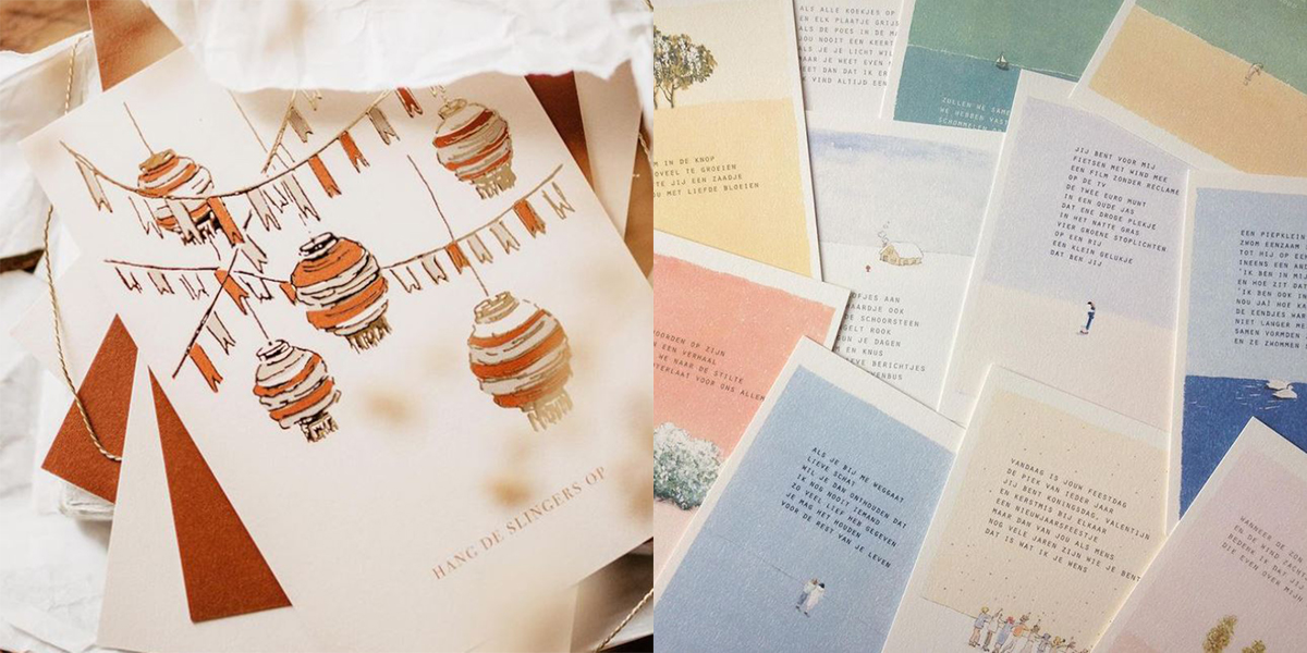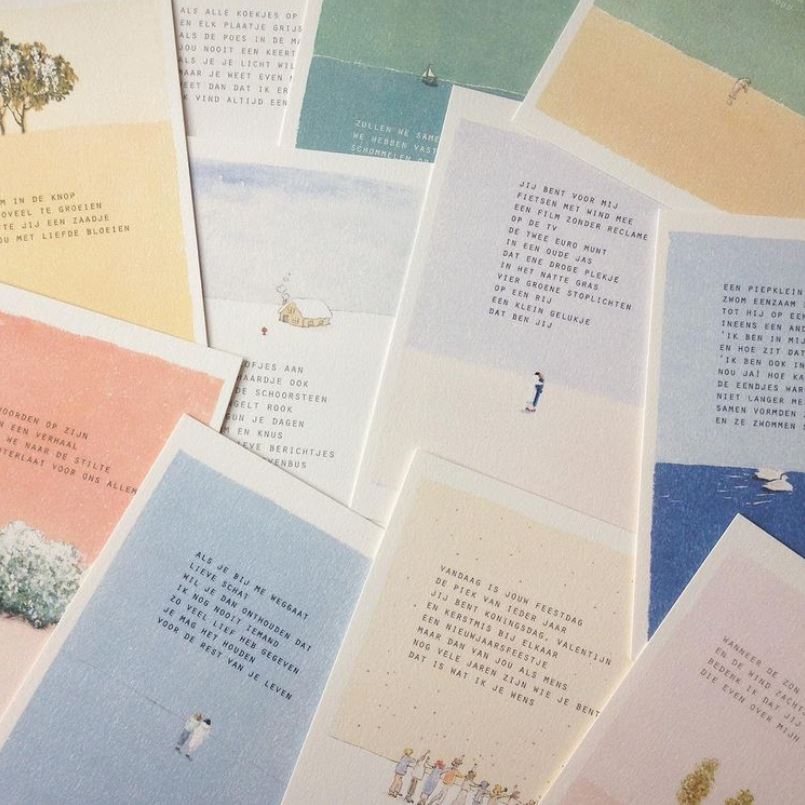 Wij vinden het altijd fijn om mooie woorden naar iemand te sturen. Het zijn vaak kleine gelukjes die op de deurmat vallen. Op de kaartjes van Amber en Willemijn (Bladergroen & Willes) vind je korte gedichtjes met daarbij illustraties. Bestellen kan via hun Instagram-pagina.