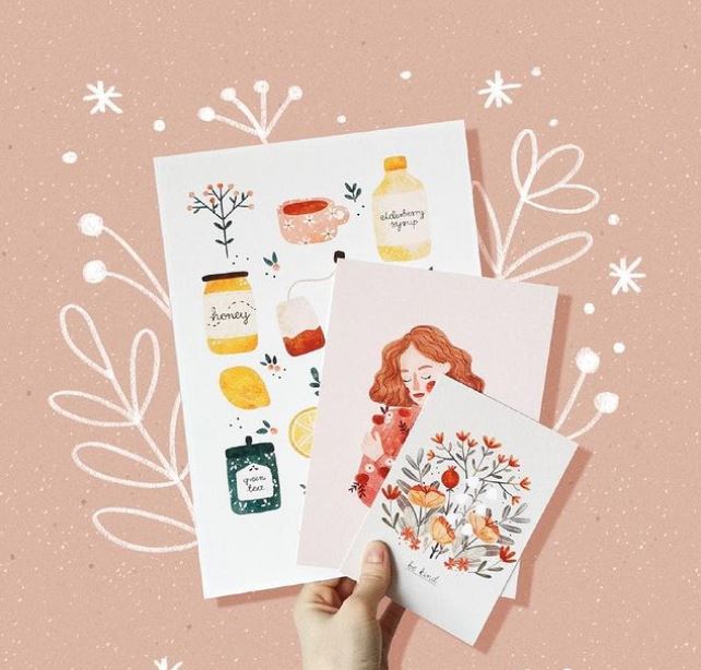 De kaartjes van de Poolse Monika zijn kleurrijk en vrolijk, vol met bloemen en fijne figuren. Je kunt de kaarten kopen via Etsy en bekijken op haar Instagram-pagina.