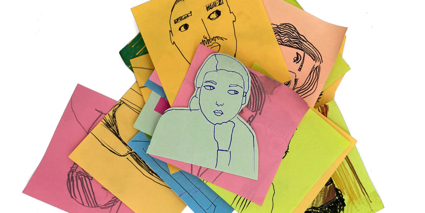 De muren in het atelier van Kay van Bellen vulden zich het afgelopen jaar met honderden schetsjes van familie, collega’s en studenten. Getekend op post-its, tijdens vele Zoom-meetings.