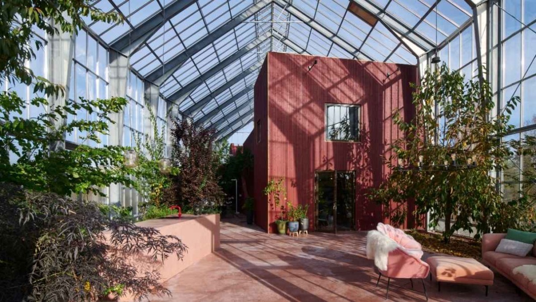 De kas is zo huge dat niet alleen het huis erin past, maar ook een binnentuin en verschillende tuinkamers. Daar kunnen planten en bomen groeien die gewoonlijk nooit zouden overleven in deze contreien, vanwege de kou.