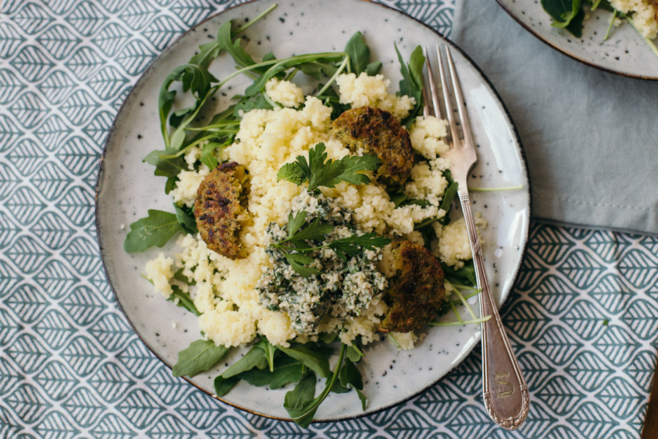 - Leg de rucola of spinazie op de borden en verdeel hier de couscous en de muntpesto over. Leg de falafel- of groenteballetjes erbovenop.