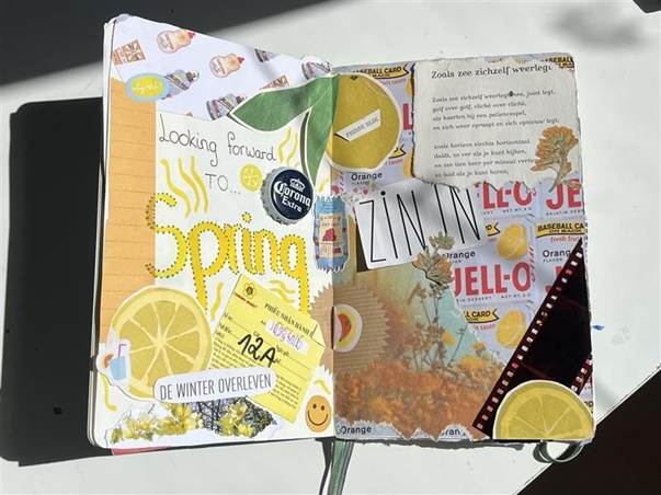 - Wat te doen met restmateriaal? Caroline: “Plak (doorzichtige) enveloppen in je journal om restmateriaal in te bewaren dat te mooi is om weg te gooien.”