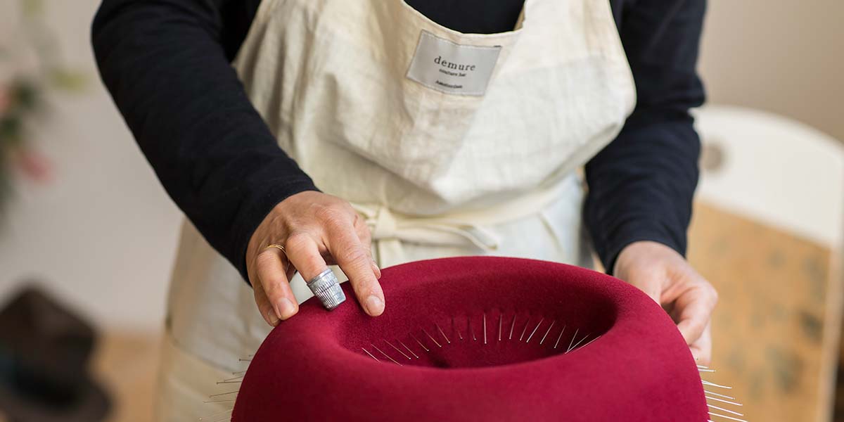 “Wat bij mij past, zijn hoeden waar de drager zich comfortabel bij voelt. Geen reusachtige of gekke bouwwerken om een uitbundige entree mee te maken, maar eerder subtiele, luxe, elegante en draagbare hoeden. Vandaar ook die naam Demure, wat in het Engels staat voor ‘bescheiden’, op een positieve manier.”